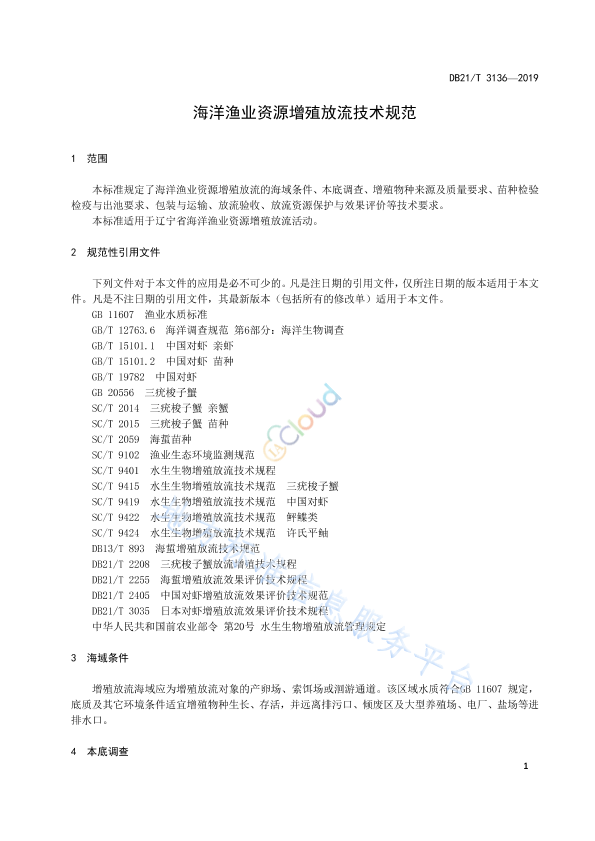 本标准规定了海洋渔业资源增殖放流的海域条件、本底调查、增殖物种来源及质量要求、苗种检验检疫与出池要求、包装与运输、放流验收、放流资源保护与效果评价等技术要求。 本标准适用于辽宁省海洋渔业资源增殖放流活动。