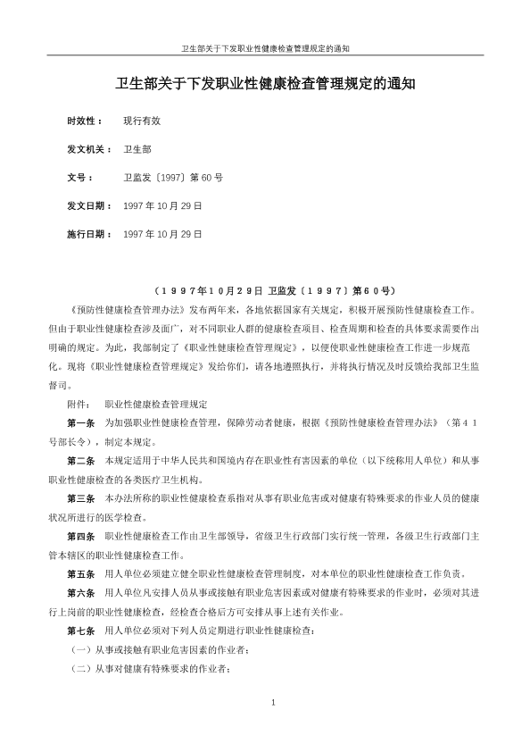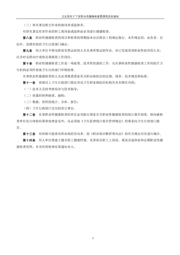 《预防性健康检查管理办法》发布两年来,各地依据国家有关规定,积极开展预防性健康检查工作。 但由于职业性健康检查涉及面广,对不同职业人群的健康检查项目、检查周期和检查的具体要求需要作出明确的规定。为此,我部制定了《职业性健康检查管理规定》,以便使职业性健康检查工作进一步规范化。现将《职业性健康检查管理规定》发给你们,请各地遵照执行,并将执行情况及时反馈给我部卫生监督司。