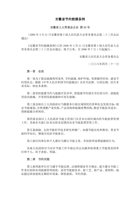 《安徽省节约能源条例》已经 2006年4月21日安徽省第十届人民代表大会常务委员会第二十三次会议通过,现予公布,自 2006 年7月1日起施行。 安徽省人民代表大会常务委员会 二零零六年四月二十一日