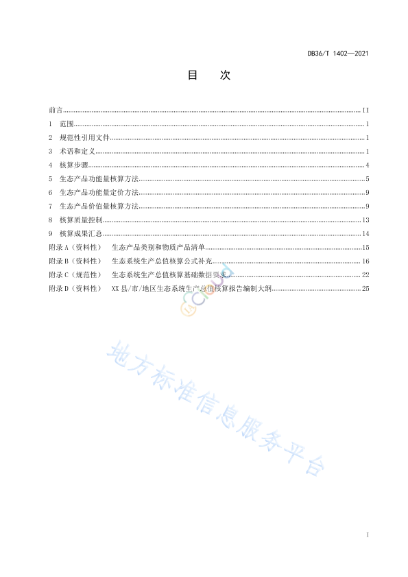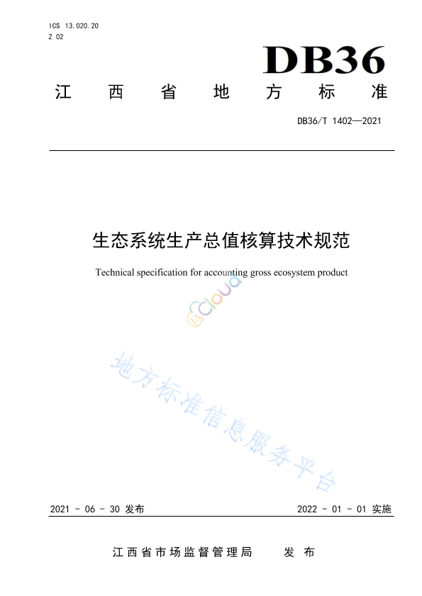 本文件按照GB/T 1.1-2020 给出的规则起草。 请注意本文件的某些内容可能涉及专利。本文件的发布机构不承担识别专利的责任。 本文件由江西省发展和改革委员会、江西省统计局、江西省市场监督管理局共同提出并归口。 本文件起草单位:抚州市发展和改革委员会、中国科学院生态环境研究中心、中国科学院地理科学与资源研究所、抚州市市场监督管理局、江西省质量和标准化研究院、江西省生态文明研究院、江西省政府投资项目评审中心、资溪县人民政府、东华理工大学、南昌大学生态文明研究院、江西财经大学生态文明研究院、江西省生态环境科学研究与规划院。 本文件主要起草人:欧阳志云、侯鹰、徐卫华、帅歌柳、江志坚、李建光、黄月荣、张巍、杨建洪、张明春、徐步朝、郑博福、谢花林、陈亚茹、曾建华、毛炜翔、周吉、王锐、刘熙、史晓燕、胡晓东、杜萍。