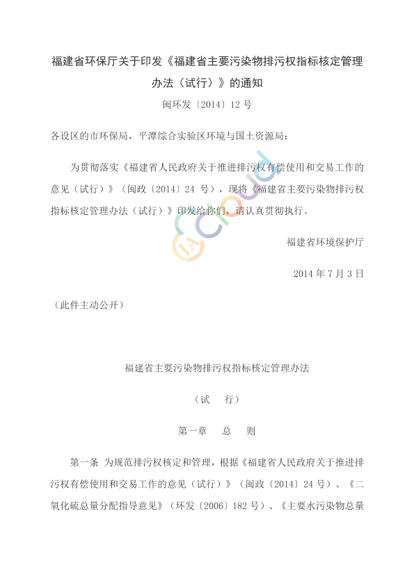 为贯彻落实《福建省人民政府关于推进排污权有偿使用和交易工作的意见(试行)》(闽政〔2014〕24号),现将《福建省主要污染物排污权指标核定管理办法(试行)》印发给你们,请认真贯彻执行。