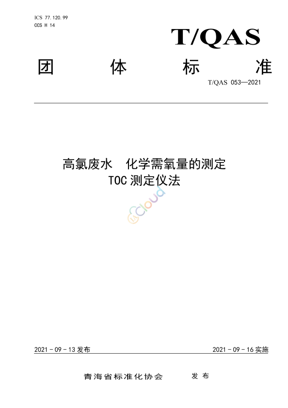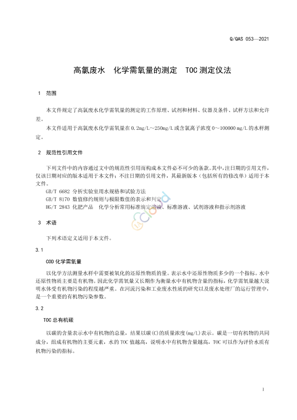 本文件规定了高氯废水化学需氧量的测定的工作原理、试剂和材料、仪器及条件、试样方法和允许差。 本文件适用于高氯废水化学需氧量在0.2mg/L~250mg/L 或含氯离子浓度0~100000 mg/L 的水样测定。