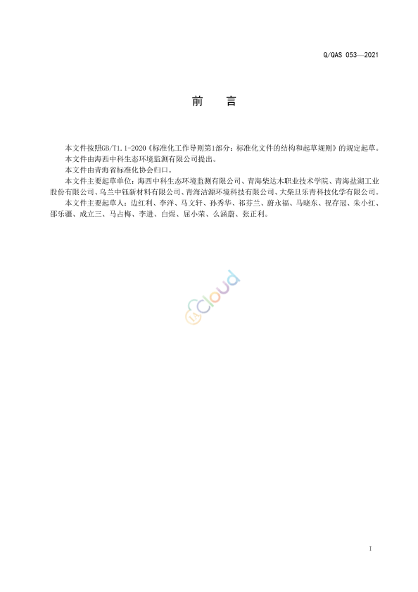 本文件按照GB/T1.1-2020《标准化工作导则第1部分:标准化文件的结构和起草规则》的规定起草。 本文件由海西中科生态环境监测有限公司提出。 本文件由青海省标准化协会归口。 本文件主要起草单位:海西中科生态环境监测有限公司、青海柴达木职业技术学院、青海盐湖工业股份有限公司、乌兰中钰新材料有限公司、青海洁源环境科技有限公司、大柴旦乐青科技化学有限公司。 本文件主要起草人:边红利、李洋、马文轩、孙秀华、祁芬兰、蔚永福、马晓东、祝存冠、朱小红、邵乐疆、成立三、马占梅、李进、白煜、屈小荣、么涵蔚、张正利。