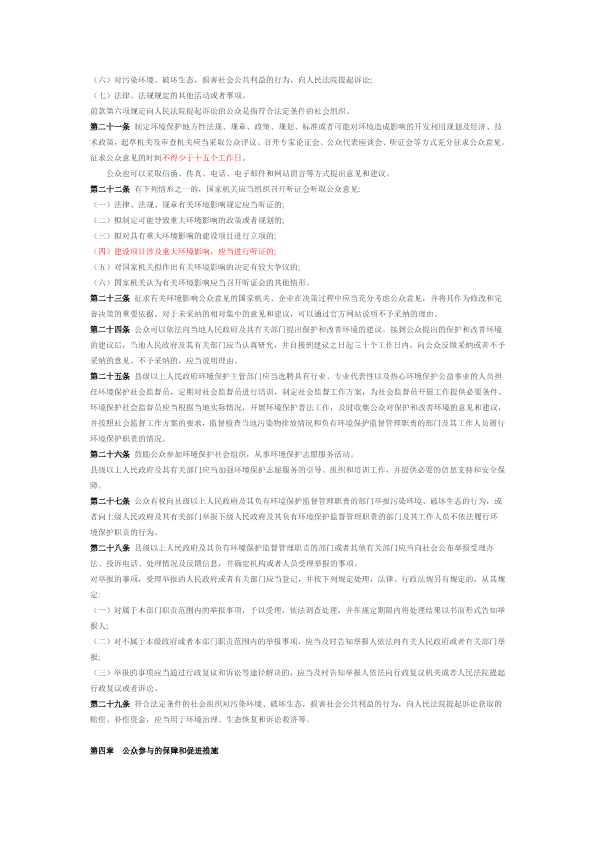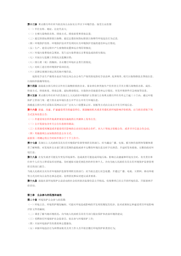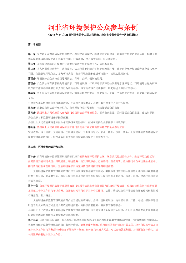 (2014 年11 月28 日河北省第十二届人民代表大会常务委员会第十一次会议通过) 第一章总则 第一条 为保障公众对环境保护的知情权、参与权和监督权,推进生态文明建设,创造良好的生产生活环境,根据《中华人民共和国环境保护法》等有关法律、行政法规,结合本省实际,制定本条例。 第二条 本省行政区域内环境保护公众参与活动及相关管理工作,适用本条例。 第三条 本条例所称公众参与,是指公民、法人和其他组织为了保护和改善环境,维护自身环境权益或者社会公共环境利益,依法获取环境信息、参与环境决策、监督环境执法和促进环境法律、法规实施等活动。 第四条 环境保护公众参与应当遵循依法、有序、公开、便利的原则。 第五条 公众依法享有获取相关环境信息,对环境决策、行政许可以及环境执法表达意见和建议,对环境违法行为和环境保护工作中不依法履行职责的行为进行举报,寻求行政或者司法救济、提起环境公益诉讼等权利。 第六条 公众应当主动接受环境保护教育,增强环境保护意识,采取绿色、低碳、节俭的生活方式,自觉履行环境保护义务。 公众参与本条例规定的事项或者活动,不得损害国家利益、社会公共利益和他人的合法权益。 第七条 企业应当依法公开环境信息,自觉履行企业环境责任,主动接受公众的监督。 第八条 县级以上人民政府及其有关部门应当依法公开环境信息,征求公众意见,及时答复公众的意见、建议和举报,为公众参与和监督环境保护提供便利。 县级以上人民政府应当建立健全相关协调和奖励机制,鼓励和支持公众积极参与环境保护。 第九条 县级以上人民政府环境保护主管部门负责本行政区域内的环境保护公众参与工作。 发展改革、国土资源、交通运输、住房城乡建设、工业和信息化、农业、林业、水利、商务、公安等其他负有环境保护监督管理职责的部门,应当在各自职责范围内做好环境保护公众参与工作。