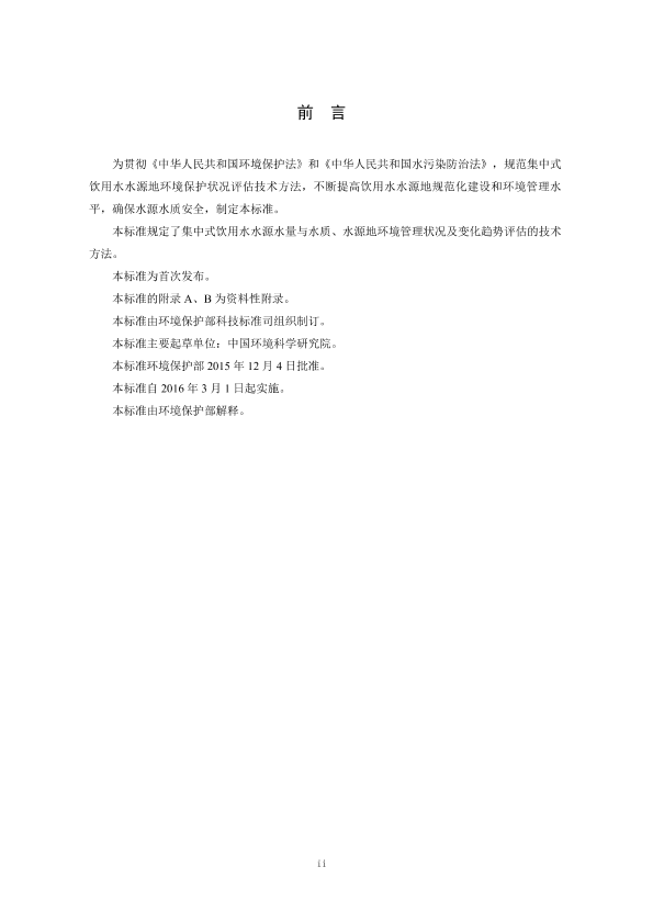 为贯彻《中华人民共和国环境保护法》和《中华人民共和国水污染防治法》,规范集中式饮用水水源地环境保护状况评估技术方法,不断提高饮用水水源地规范化建设和环境管理水平,确保水源水质安全,制定本标准。 本标准规定了集中式饮用水水源水量与水质、水源地环境管理状况及变化趋势评估的技术方法。 本标准为首次发布。 本标准的附录 A、B 为资料性附录。 本标准由环境保护部科技标准司组织制订。 本标准主要起草单位:中国环境科学研究院。 本标准环境保护部 2015 年 12 月 4 日批准。 本标准自 2016 年 3 月 1 日起实施。 本标准由环境保护部解释。