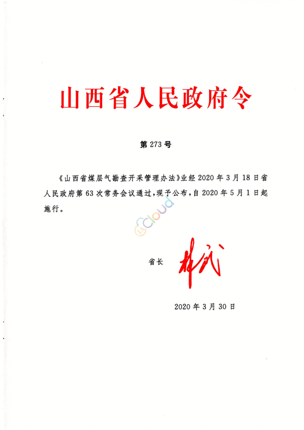 《山西省煤层气勘查开采管理办法》业经2020年3月18日省人民政府第63次常务会议通过,现予公布,自2020年5月1日起施行。