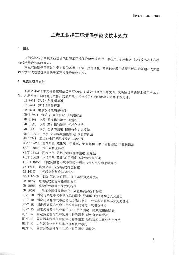 本标准规定了兰炭工业建设项目竣工环境保护验收技术的工作程序、总体要求,验收技术方案和验收技术报告的编制要求。 本标准适用于陕西省兰炭工业的备煤、干馏、煤气净化、筛焦储焦及干馏煤气脱硫的新建、改扩建以及技术改造建设项目的竣工环境保护验收工作。