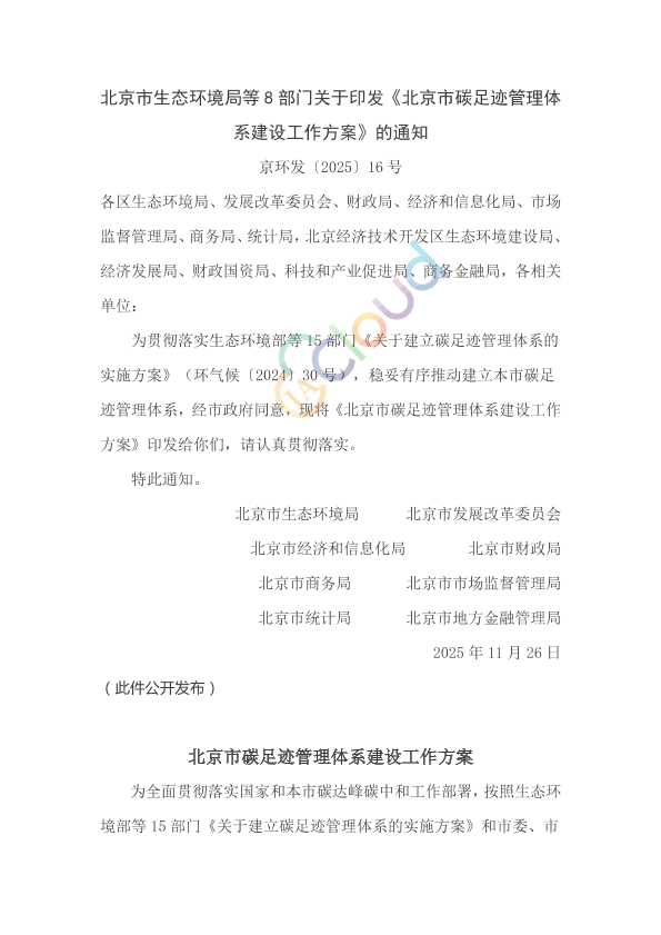各区生态环境局、发展改革委员会、财政局、经济和信息化局、市场监督管理局、商务局、统计局,北京经济技术开发区生态环境建设局、经济发展局、财政国资局、科技和产业促进局、商务金融局,各相关单位: 为贯彻落实生态环境部等15部门《关于建立碳足迹管理体系的实施方案》(环气候〔2024〕30号),稳妥有序推动建立本市碳足迹管理体系,经市政府同意,现将《北京市碳足迹管理体系建设工作方案》印发给你们,请认真贯彻落实。 特此通知。 北京市生态环境局 北京市发展改革委员会 北京市经济和信息化局 北京市财政局 北京市商务局 北京市市场监督管理局 北京市统计局 北京市地方金融管理局 2025年11月26日