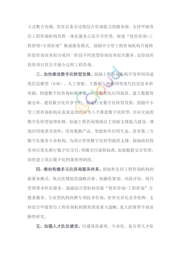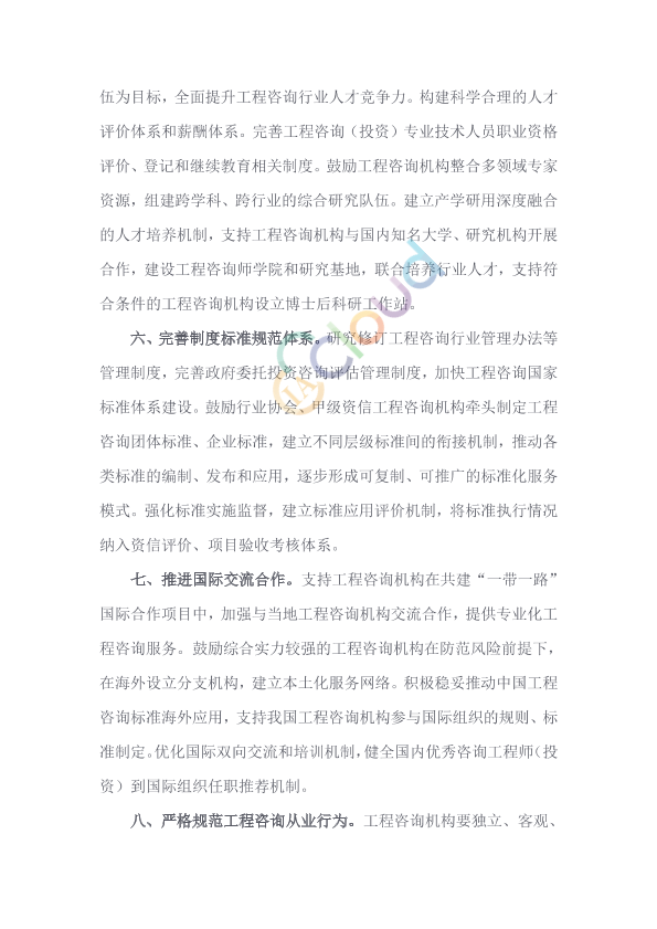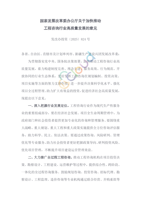 各省、自治区、直辖市及计划单列市、新疆生产建设兵团发展改革委: 为贯彻落实党中央、国务院决策部署,加快推动工程咨询行业高质量发展,着力构建制度完善、理念先进、服务高效、行为规范、开放协同的行业生态体系,更好发挥工程咨询在规划编制、投资决策、项目实施等方面的智力支撑作用,进一步提升决策科学化水平、强化项目全过程管理、助力扩大有效益的投资,促进经济社会高质量发展,现提出以下意见。