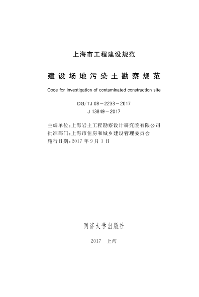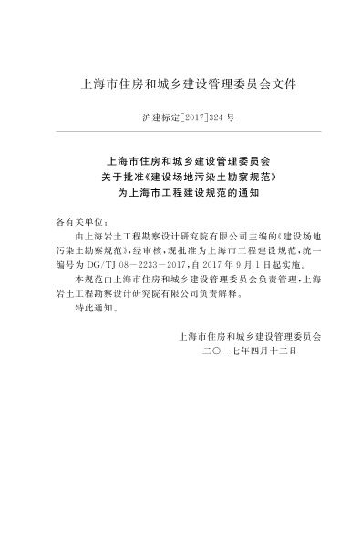 各有关单位: 由上海岩土工程勘察设计研究院有限公司主编的《建设场地污染土勘察规范》,经审核,现批准为上海市政工程建设规范,统一编号为DG/TJ08-2233-2017,自2017年9月1日起实施。 本规范由上海市住房和城乡建设管理委员会负责管理,上海岩土工程勘察设计研究院有限公司负责解释。 特此通知。 上海市住房和城乡建设管理委员会 二零一七年四月十二日