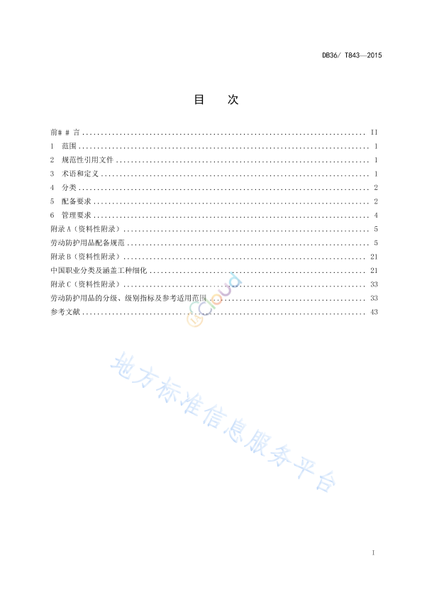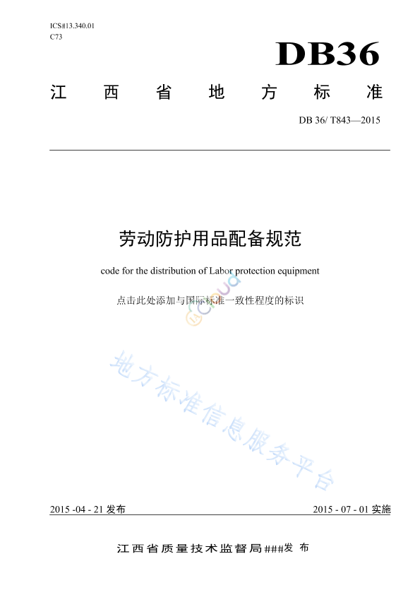 本标准规定了劳动防护用品配备的术语和定义、分类和标记、配备要求、管理要求。 本标准适用于江西省行政区域内所有企业、事业单位和个体经济组织等生产经营单位相应职业或岗位的劳动防护用品的配备。