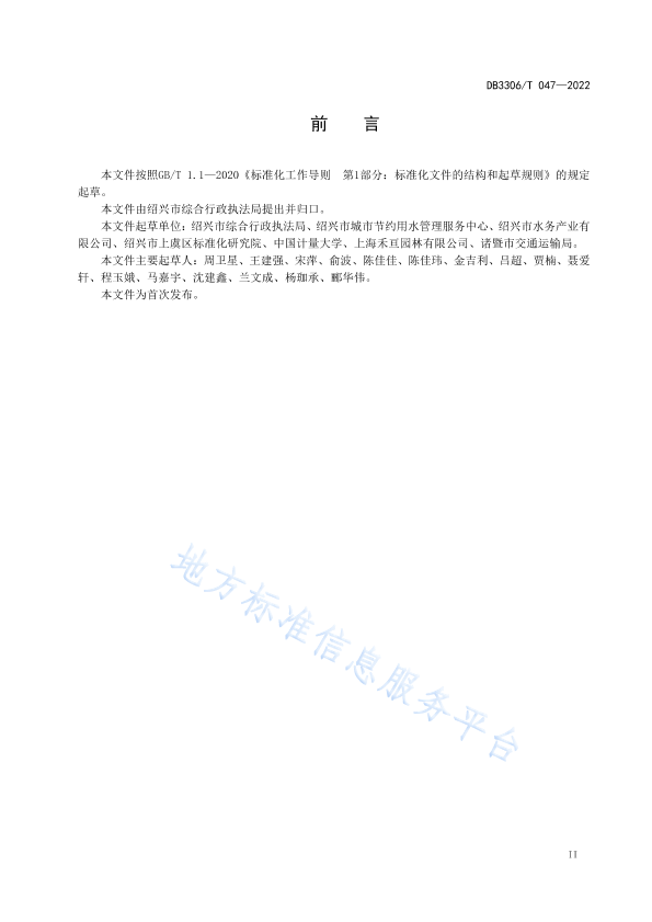 本文件按照GB/T 1.1—2020《标准化工作导则 第1部分:标准化文件的结构和起草规则》的规定起草。 本文件由绍兴市综合行政执法局提出并归口。 本文件起草单位:绍兴市综合行政执法局、绍兴市城市节约用水管理服务中心、绍兴市水务产业有限公司、绍兴市上虞区标准化研究院、中国计量大学、上海禾亘园林有限公司、诸暨市交通运输局。