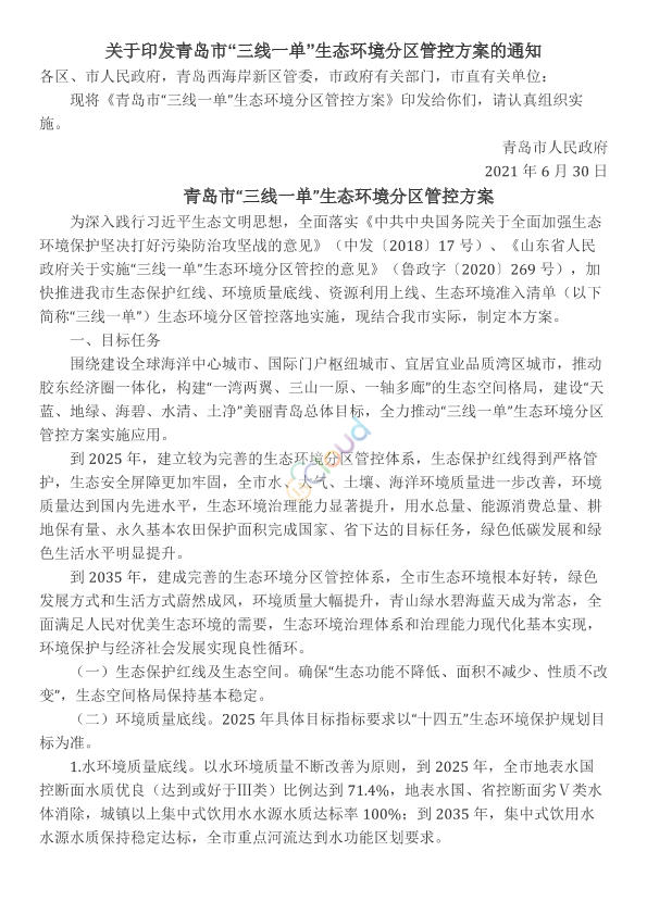 各区、市人民政府,青岛西海岸新区管委,市政府有关部门,市直有关单位: 现将《青岛市“三线一单”生态环境分区管控方案》印发给你们,请认真组织实施。 青岛市人民政府 2021年6月30日
