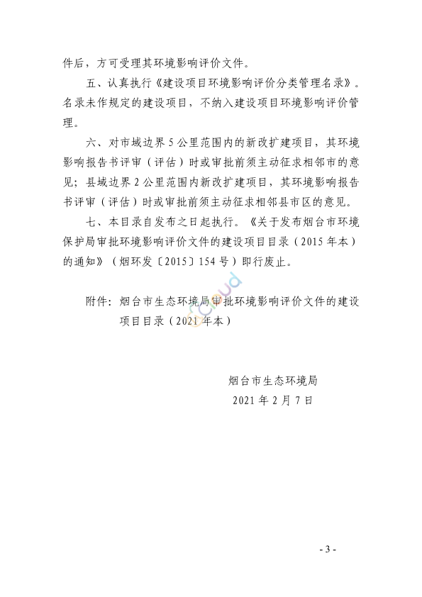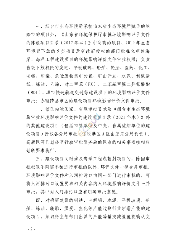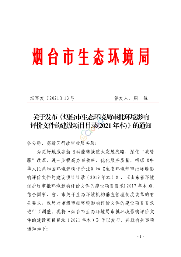 各分局、高新区行政审批服务局: 为更好地服务新旧动能转换重大发展战略,深化“放管服”改革,进一步提高办事效率,优化服务质量,根据《中华人民共和国环境影响评价法》和《生态环境部审批环境影响评价文件的建设项目目录(2019 年本)》、《山东省环境保护厅审批环境影响评价文件的建设项目目录(2017 年本)》,结合国家、省、市关于生态环境机构垂直管理制度改革的有关要求,我局对市级审批环境影响评价文件的建设项目目录进行了调整。现将《烟台市生态环境局审批环境影响评价文件的建设项目目录(2021 年本)》予以发布,并就有关事项通知如下: