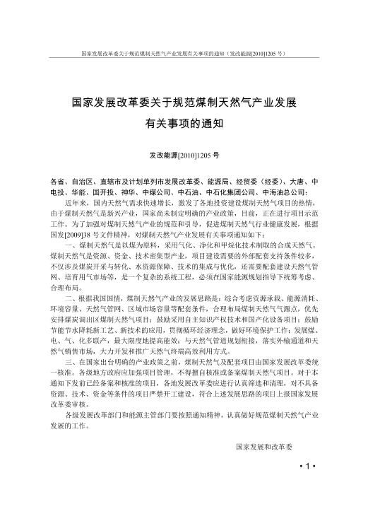 近年来,国内天然气需求快速增长,激发了各地投资建设煤制天然气项目的热情,由于煤制天然气是新兴产业,国家尚未制定明确的产业政策,目前,正在进行项目示范工作。为了加强对煤制天然气产业的规范和引导,促进煤制天然气行业健康发展,根据国发[2009]38号文件精神,对煤制天然气产业发展有关事项通知如下: 一、煤制天然气是以煤为原料,采用气化、净化和甲烷化技术制取的合成天然气。煤制天然气是资源、资金、技术密集型产业,项目建设需要的外部配套支持条件较多,不仅涉及煤炭开采与转化、水资源保障、技术的集成与优化,还需要配套建设天然气管网、培育用气市场等,是一个复杂的系统工程,必须在国家能源规划指导下统筹考虑、合理布局。 二、根据我国国情,煤制天然气产业的发展思路是:综合考虑资源承载、能源消耗、环境容量、天然气管网、区域市场容量等配套条件,合理布局煤制天然气气源点,优先安排煤炭调出区煤制天然气项目;鼓励采用自主知识产权技术和国产化设备项目;鼓励节能节水降耗新工艺、新技术的应用,贯彻循环经济理念,做好环境保护工作;发展煤、电、气、化多联产,最大限度地提高能效;与天然气管道规划衔接,落实外输通道和天然气销售市场,大力开发和推广天然气终端高效利用方式。 三、在国家出台明确的产业政策之前,煤制天然气及配套项目由国家发展改革委统一核准。各级地方政府应加强项目管理,不得擅自核准或备案煤制天然气项目。对于本通知下发前已经备案和核准的项目,各地发展改革委应进行认真筛选和清理,对不具备资源、技术、资金等条件的项目严禁开工建设,符合上述发展思路的项目上报国家发展改革委审核。 各级发展改革部门和能源主管部门要按照通知精神,认真做好规范煤制天然气产业发展的工作。