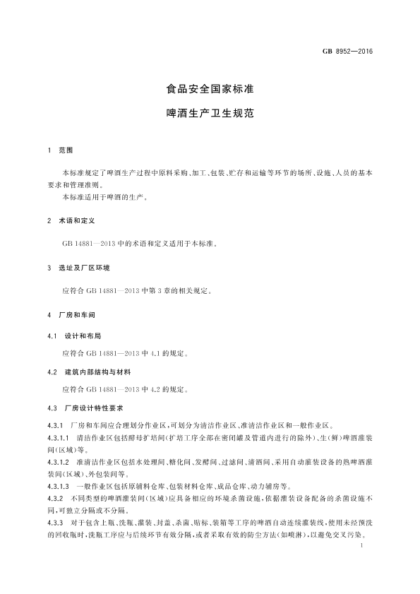 本标准代替GB8952—1988《啤酒厂卫生规范》。 本标准与GB8952—1988相比,主要变化如下: ———标准名称修改为“食品安全国家标准 啤酒生产卫生规范”; ———修改了标准结构; ———增加了产品召回和管理的要求; ———增加了培训的要求; ———增加了管理制度和人员的要求; ———增加了附录A“企业自产自用二氧化碳检验项目和要求”和附录B“啤酒加工过程的微生物监控程序指南”。