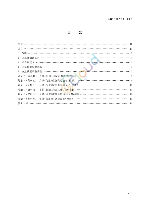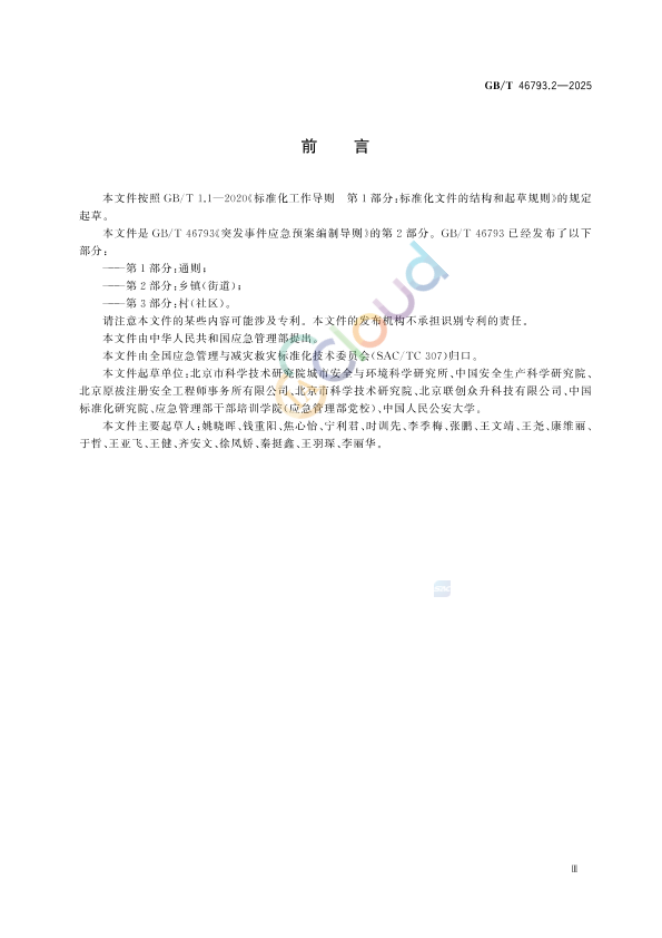 本文件按照GB/T1.1—2020《标准化工作导则第1部分:标准化文件的结构和起草规则》的规定起草。 本 文件是GB/T46793《突发事件应急预案编制导则》的第2部分。GB/T46793已经发布了以下部分: ———第1部分:通则; ———第2部分:乡镇(街道); ———第3部分:村(社区)。 请注意本文件的某些内容可能涉及专利。本文件的发布机构不承担识别专利的责任。 本文件由中华人民共和国应急管理部提出。 本文件由全国应急管理与减灾救灾标准化技术委员会(SAC/TC307)归口。 本文件起草单位:北京市科学技术研究院城市安全与环境科学研究所、中国安全生产科学研究院、北京原祓注册安全工程师事务所有限公司、北京市科学技术研究院、北京联创众升科技有限公司、中国 标准化研究院、应急管理部干部培训学院(应急管理部党校)、中国人民公安大学。 本文件主要起草人:姚晓晖、钱重阳、焦心怡、宁利君、时训先、李季梅、张鹏、王文靖、王尧、康维丽、于哲、王亚飞、王健、齐安文、徐凤娇、秦挺鑫、王羽琛、李丽华。