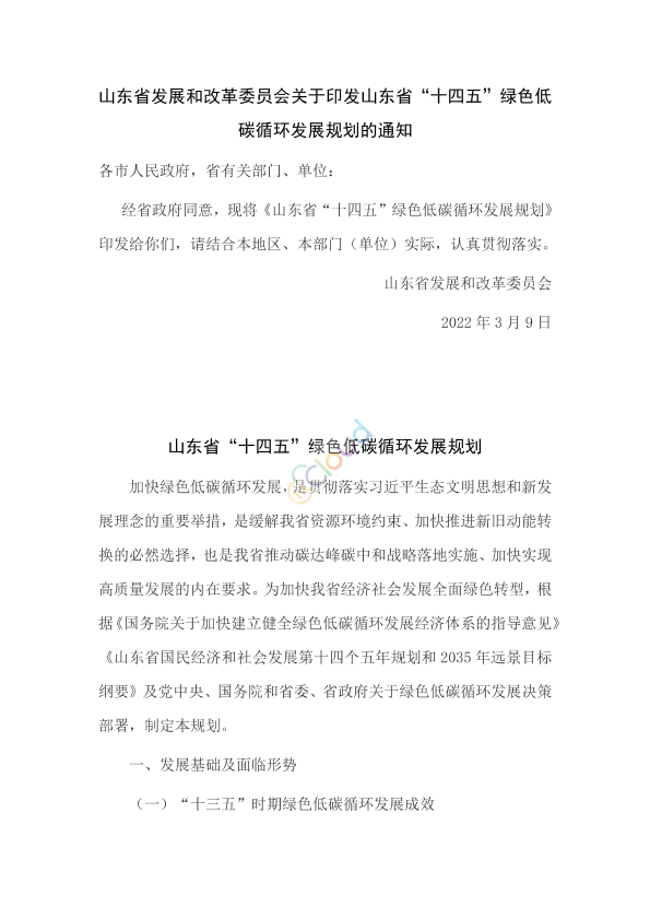 各市人民政府,省有关部门、单位: 经省政府同意,现将《山东省“十四五”绿色低碳循环发展规划》印发给你们,请结合本地区、本部门(单位)实际,认真贯彻落实。 山东省发展和改革委员会 2022年3月9日