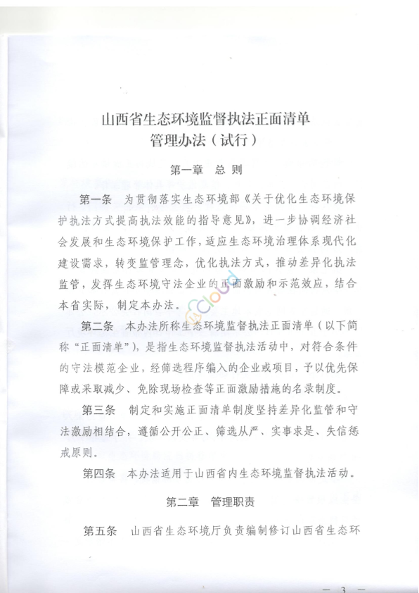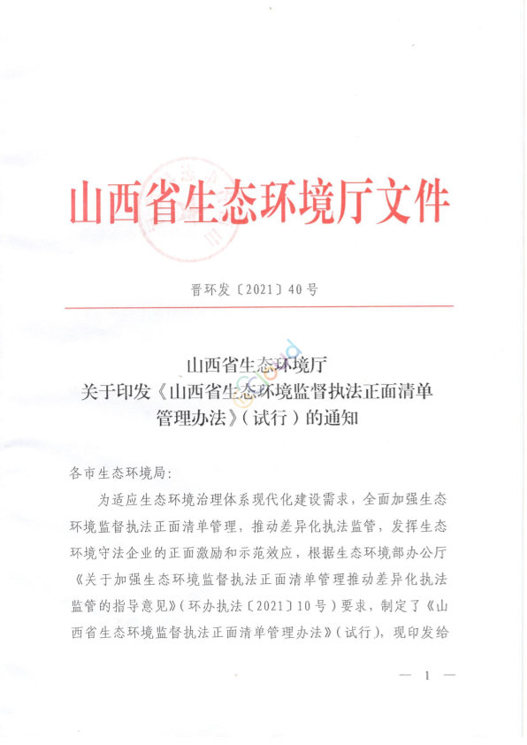 各市生态环境局: 为适应生态环境治理体系现代化建设需求,全面加强生态环境监督执法正面清单管理,推动差异化执法监管,发挥生态环境守法企业的正面激励和示范效应,根据生态环境部办公厅《关于加强生态环境监督执法正面清单管理推动差异化执法监管的指导意见》(环办执法〔2021]10号)要求,制定了《山西省生态环境监督执法正面清单管理办法》(试行),现印发你们,请结合实际,认真遵照执行。