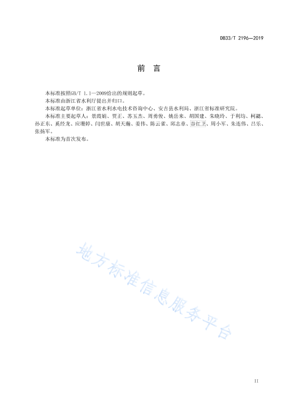 本标准按照GB/T1.1—2009给出的规则起草。 本标准由浙江省水利厅提出并归口。 本标准起草单位:浙江省水利水电技术咨询中心、安吉县水利局、浙江省标准研究院。 本标准主要起草人:景霞娟、贾正、苏玉杰、周勇俊、姚岳来、胡国建、朱晓玲、于利均、柯勰、孙正东、奚经龙、应珊婷、闫世康、胡天瀚、姜伟、陈云雀、邱志章、谷红卫、周小军、朱连伟、吕乐、张扬军。 本标准为首次发布。