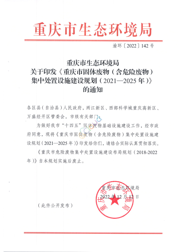 各区县(自治县)人民政府,两江新区、西部科学城重庆高新区、万盛经开区管委会,市级有关部门: 为做好我市“十四五”固体废物基础设施建设工作,经市政府同意,现将《重庆市固体废物(含危险废物)集中处置设施建设规划(2021—2025年)》印发给你们,请结合实际认真贯彻落实。 《重庆市危险废物集中处置设施建设布局规划(2018—2022年)》自本规划实施后废止。 重庆市生态环境局 2022年12月12日