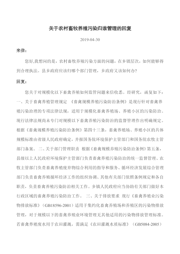 来信: 您好,我想问的是,农村畜牧养殖污染方面的问题,在乡镇层次,如何能够得到合理执法。县乡政府应该归哪个部门管理,乡政府又该如何办?