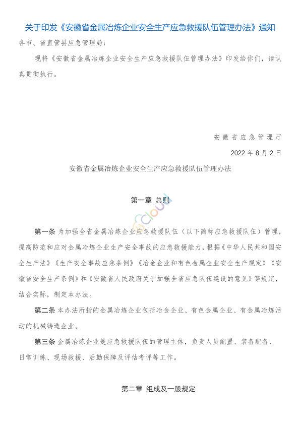 各市、省直管县应急管理局: 现将《安徽省金属冶炼企业安全生产应急救援队伍管理办法》印发给你们,请认真贯彻执行。 安 徽 省 应 急 管 理 厅 2022年8月2日