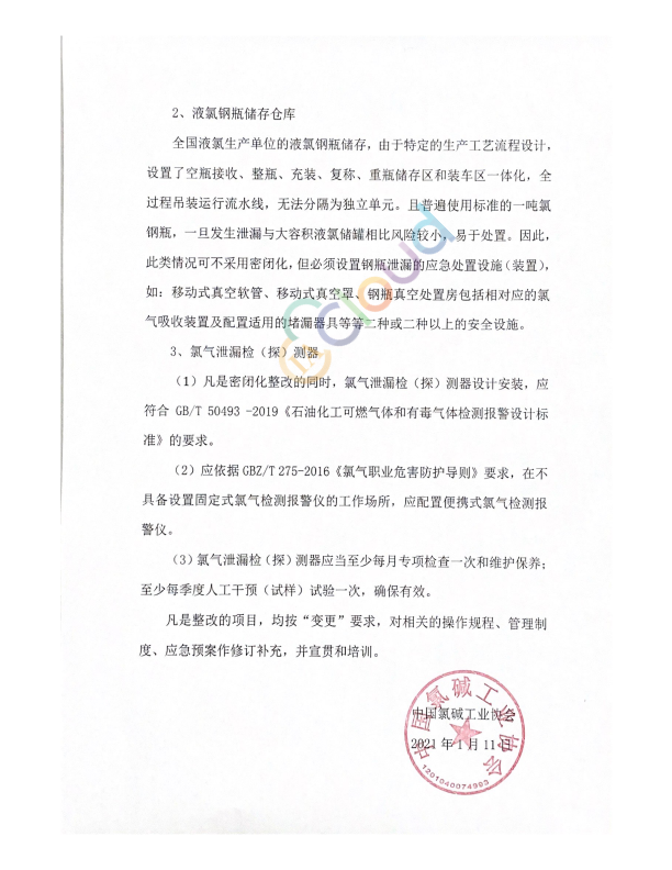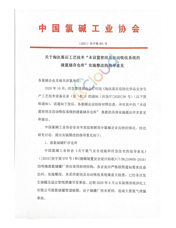 各氯碱企业及相关涉氯单位: 2020年10月,应急管理部办公厅印发《淘汰落后危险化学品安全生产工艺技术设备目录(第一批)》的通知(应急厅[2020]38号)(以下简称通知),该通知下发后,各氯碱企业纷纷对照自查,并对其中的“未设置密闭及自动吸收系统的液氯储存仓库”条款的具体实施提出许多意见和建议。 中国氯碱工业协会安全专家组根据部分氯碱企业反映的情况,经过研究讨论,提出实施整改的指导意见如下: