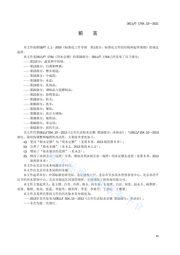 本文件按照GB/T1.1—2020《标准化工作导则 第1部分:标准化文件的结构和起草规则》的规定起草。 本文件是DB11/T1764《用水定额》的第33部分。DB11/T1764已经发布了以下部分: ——第2部分:蔬菜和中药材; ——第13部分:白酒和啤酒; ——第15部分:整车制造; ——第16部分:中成药; ——第18部分:水泥; ——第19部分:乳制品; ——第20部分:调味品与发酵制品; ——第22部分:焙烤食品; ——第28部分:机关; ——第30部分:洗车; ——第32部分:餐饮; ——第35部分:高尔夫球场; ——第39部分:地铁站; ——第40部分:客运站; ——第42部分:居民生活。 本文件代替DB11/554.10—2013《公共生活取水定额第10部分:沐浴业》,与DB11/554.10—2013相比,除结构调整和编辑性改动外,主要技术变化如下: a) 更改“取水定额”为“用水定额”(见第5 章,2013版的第5章); b) 完善了“取水水源”(见4.1,2013版的4.1.1); c) 增加了“取水量供给范围”(见4.2); d) 修改了沐浴企业(场所)分类,增加各类沐浴企业(场所)用水定额先进值(见第5章,2013版的第5章)。本文件由北京市水务局提出并归口。 本文件由北京市水务局组织实施。 本文件起草单位:中国标准化研究院、北京建筑大学、北京市节水用水管理事务中心、北京市昌平区节约用水管理中心、北京市海淀区河道管理所、中国国际工程咨询有限公司。 本文件主要起草人:张玉博、白雪、许萍、韩玉、何东海、朱春雁、白岩、何思、赵永夫、胡梦婷、高原、蔡榕、张岚、张蕊、李振华、姚华萍、李莹、李秋月、于劲松、王雅慧。 本文件及其所代替的文件的历次版本发布情况为: ——2013年首次发布为DB11/554.10—2013《公共生活取水定额第10部分:沐浴业》; ——本次为第一次修订。