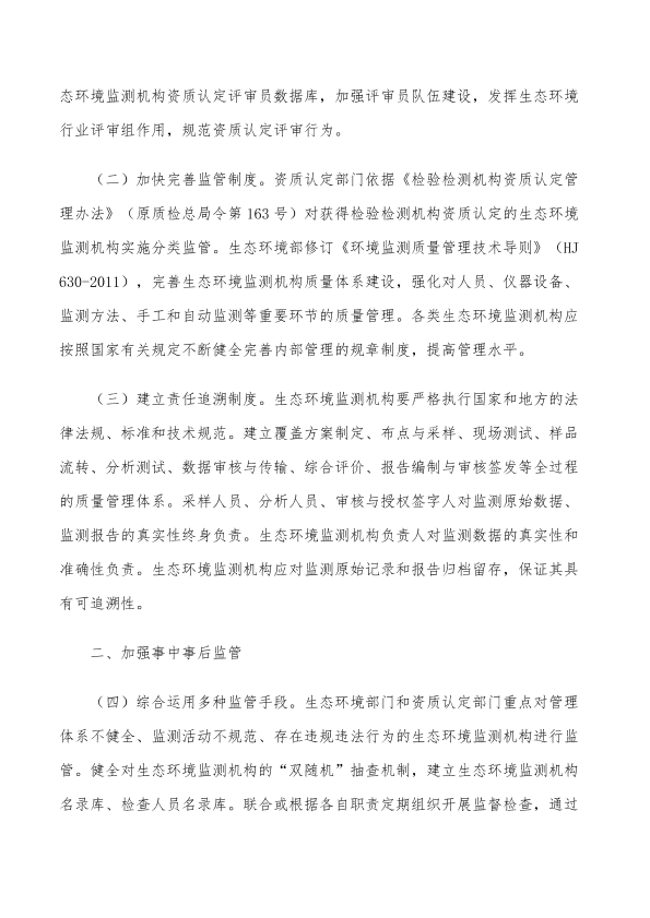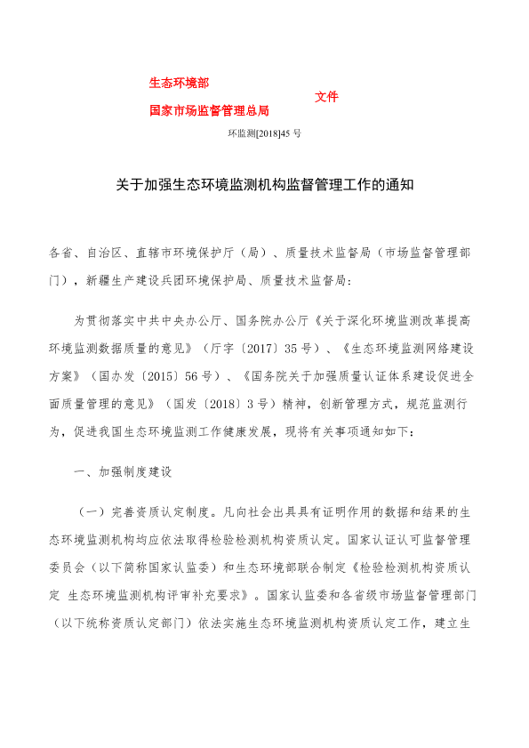 各省、自治区、直辖市环境保护厅(局)、质量技术监督局(市场监督管理部门),新疆生产建设兵团环境保护局、质量技术监督局: 为贯彻落实中共中央办公厅、国务院办公厅《关于深化环境监测改革提高环境监测数据质量的意见》(厅字〔2017〕35号)、《生态环境监测网络建设方案》(国办发〔2015〕56号)、《国务院关于加强质量认证体系建设促进全面质量管理的意见》(国发〔2018〕3号)精神,创新管理方式,规范监测行为,促进我国生态环境监测工作健康发展,现将有关事项通知如下