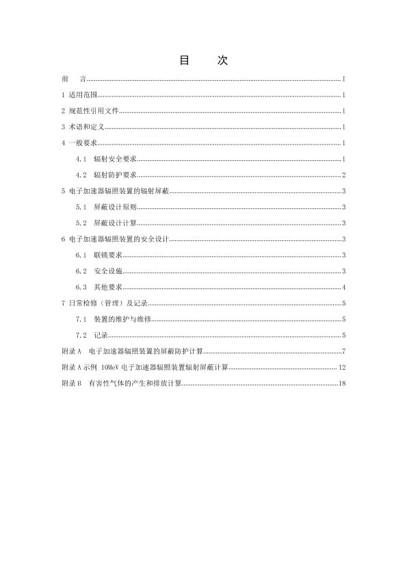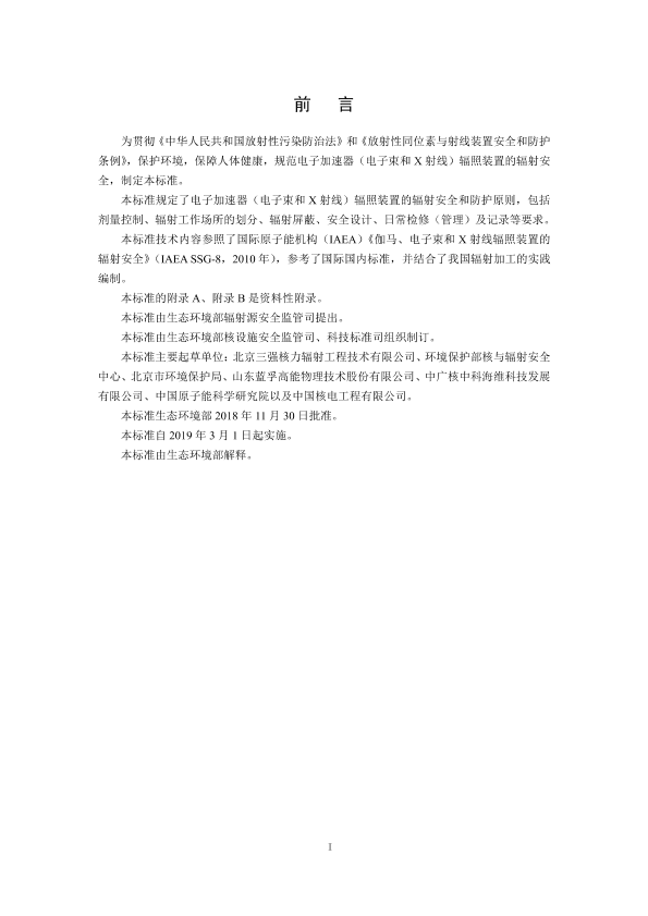 为贯彻《中华人民共和国放射性污染防治法》和《放射性同位素与射线装置安全和防护条例》,保护环境,保障人体健康,规范电子加速器(电子束和X 射线)辐照装置的辐射安全,制定本标准。 本标准规定了电子加速器(电子束和X 射线)辐照装置的辐射安全和防护原则,包括剂量控制、辐射工作场所的划分、辐射屏蔽、安全设计、日常检修(管理)及记录等要求。 本标准技术内容参照了国际原子能机构(IAEA)《伽马、电子束和X 射线辐照装置的辐射安全》(IAEA SSG-8,2010 年),参考了国际国内标准,并结合了我国辐射加工的实践编制。 本标准的附录A、附录B 是资料性附录。 本标准由生态环境部辐射源安全监管司提出。 本标准由生态环境部核设施安全监管司、科技标准司组织制订。 本标准主要起草单位:北京三强核力辐射工程技术有限公司、环境保护部核与辐射安全中心、北京市环境保护局、山东蓝孚高能物理技术股份有限公司、中广核中科海维科技发展有限公司、中国原子能科学研究院以及中国核电工程有限公司。 本标准生态环境部2018 年11 月30 日批准。 本标准自2019 年3 月1 日起实施。 本标准由生态环境部解释。