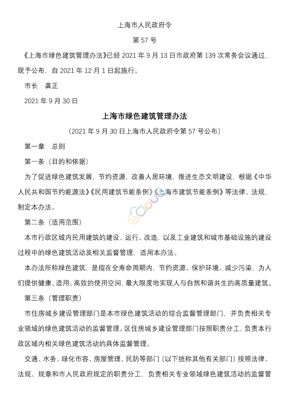 《上海市绿色建筑管理办法》已经2021年9月13日市政府第139次常务会议通过,现予公布,自2021年12月1日起施行。 市长 龚正 2021年9月30日