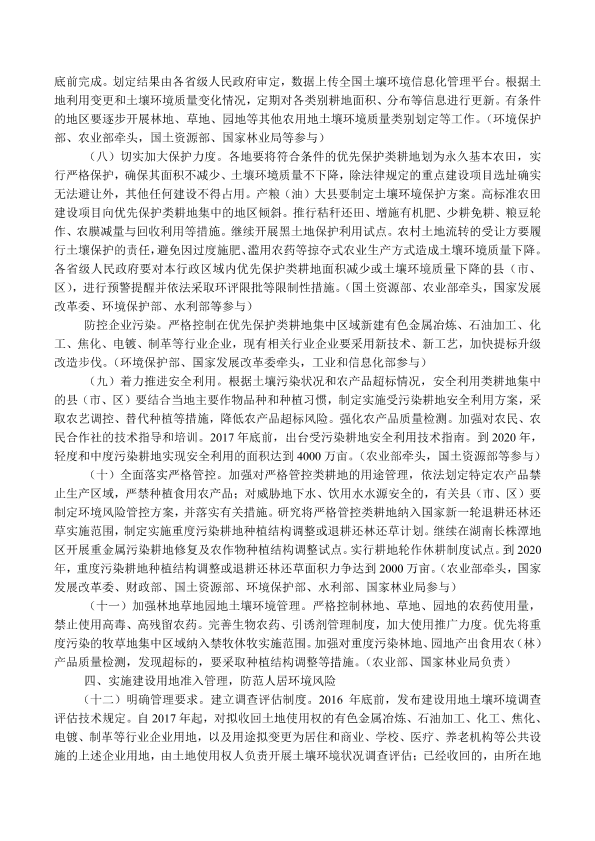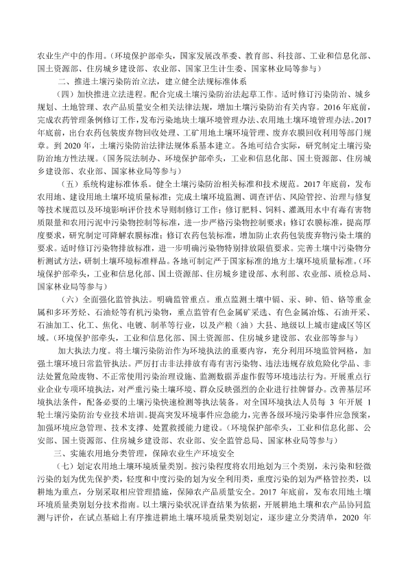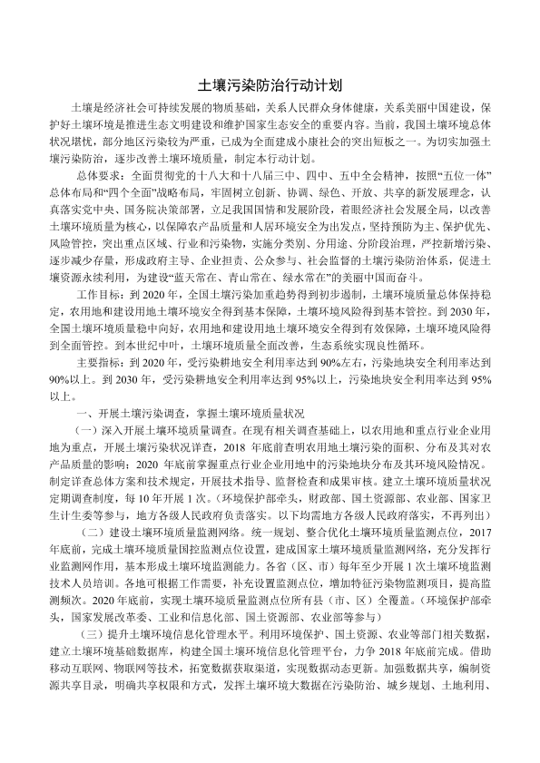 各省、自治区、直辖市人民政府,国务院各部委、各直属机构: 现将《土壤污染防治行动计划》印发给你们,请认真贯彻执行。 国务院 2016年5月28日 (此件公开发布)