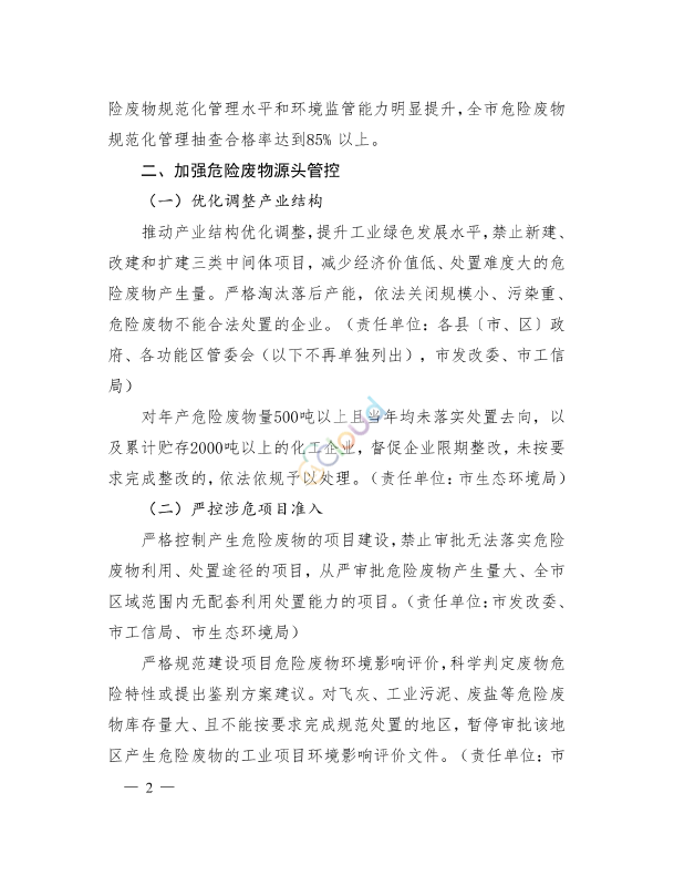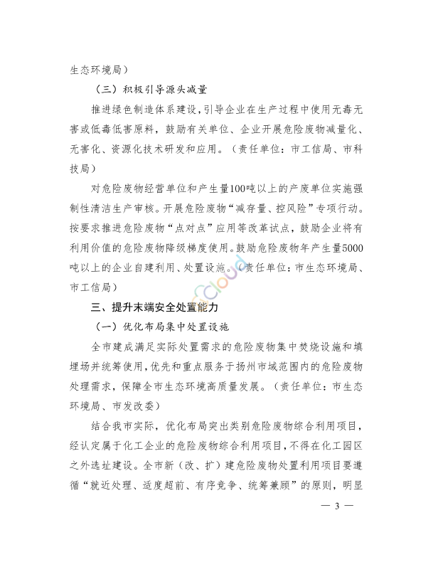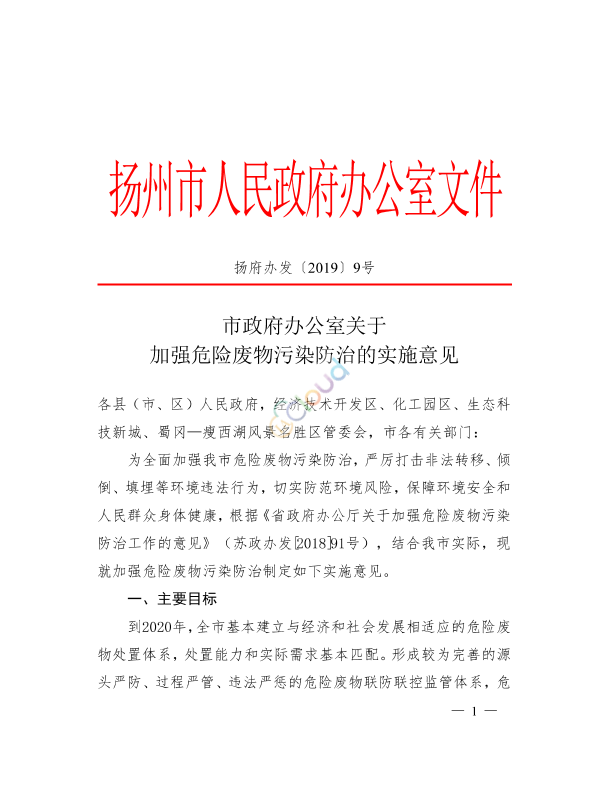 各县(市、区)人民政府,经济技术开发区、化工园区、生态科技新城、蜀冈一瘦西湖风景名胜区管委会,市各有关部门: 为全面加强我市危险废物污染防治,严厉打击非法转移、倾倒、填埋等环境违法行为,切实防范环境风险,保障环境安全和人民群众身体健康,根据《省政府办公厅关于加强危险废物污染防治工作的意见》(苏政办发 2018]91号),结合我市实际,现就加强危险废物污染防治制定如下实施意见。