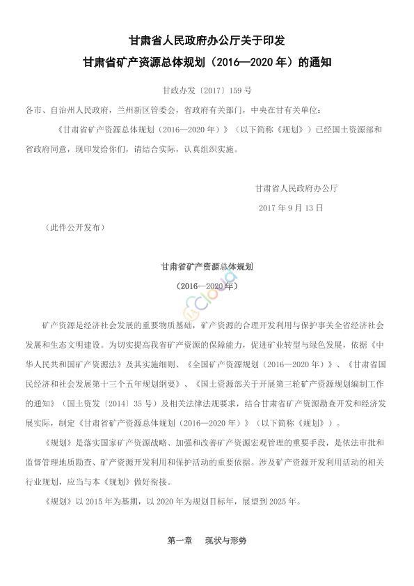 甘政办发〔2017〕159号 各市、自治州人民政府,兰州新区管委会,省政府有关部门,中央在甘有关单位: 《甘肃省矿产资源总体规划(2016—2020年)》(以下简称《规划》)已经国土资源部和省政府同意,现印发给你们,请结合实际,认真组织实施。 甘肃省人民政府办公厅 2017年9月13日 (此件公开发布)