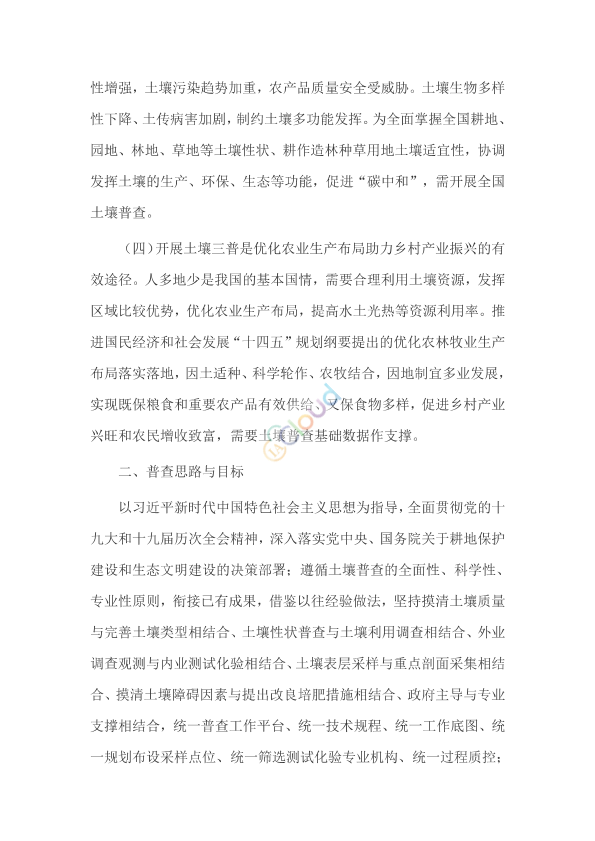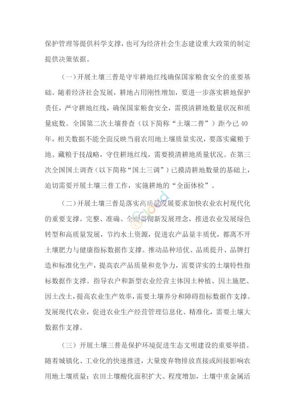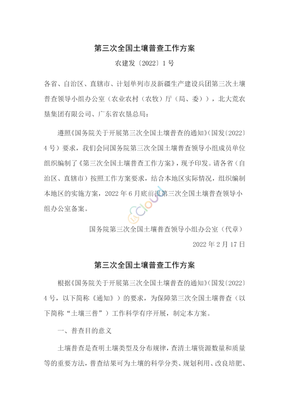 各省、自治区、直辖市、计划单列市及新疆生产建设兵团第三次土壤普查领导小组办公室(农业农村(农牧)厅(局、委)),北大荒农垦集团有限公司、广东省农垦总局: 遵照《国务院关于开展第三次全国土壤普查的通知》(国发〔2022〕4号)要求,我们会同国务院第三次全国土壤普查领导小组成员单位组织编制了《第三次全国土壤普查工作方案》,现予印发。请各省(自治区、直辖市)按照工作方案要求,结合本地区实际情况,组织编制本地区的实施方案,2022年6月底前报第三次全国土壤普查领导小组办公室备案。 国务院第三次全国土壤普查领导小组办公室(代章) 2022年2月17日
