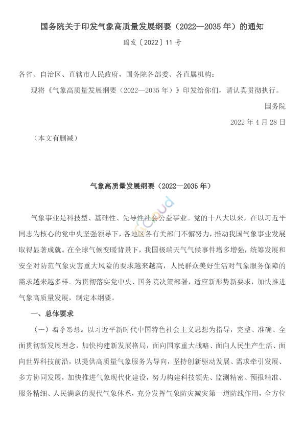 各省、自治区、直辖市人民政府,国务院各部委、各直属机构: 现将《气象高质量发展纲要(2022—2035年)》印发给你们,请认真贯彻执行。 国务院 2022年4月28日 (本文有删减)