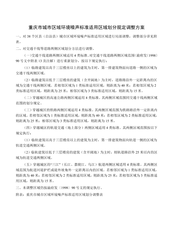 各区县(自治县)环保局,市环保局经开区、高新区分局: 近年来,我市城镇化规模迅速扩大,城市交通高速发展,部分城市区域的功能及声环境发生了一定变化。为适应声环境保护的新形势,提高城市声环境质量,满足人民群众对声环境的要求,根据《重庆市城市区域环境噪声污染防治办法》(重庆市人民政府第126号令)、《重庆市城市区域环境噪声标准适用区域划分规定》(渝府发〔1998〕90号),结合区县经济、社会、环境发展状况,我局编制了《重庆市城市区域环境噪声标准适用区域划分规定调整方案》。经市政府同意,现将该《方案》印发你们,请遵照执行。 附件:重庆市城市区域环境噪声标准适用区域划分规定调整方案 二○○七年五月二十九日