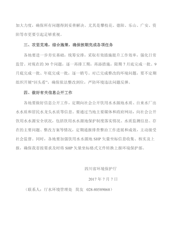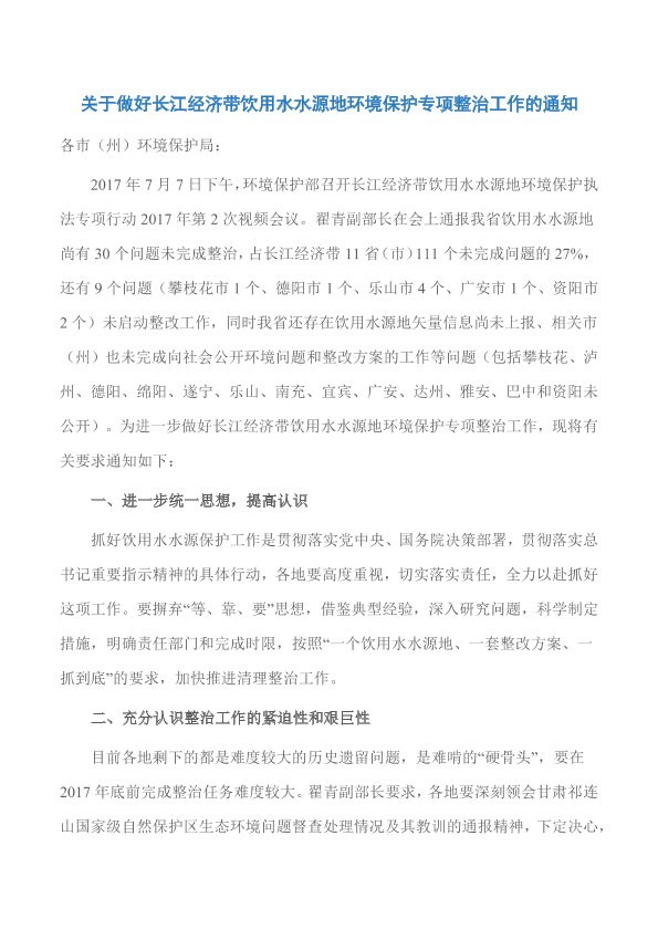 各市(州)环境保护局: 2017年7月7日下午,环境保护部召开长江经济带饮用水水源地环境保护执法专项行动2017年第2次视频会议。翟青副部长在会上通报我省饮用水水源地尚有30个问题未完成整治,占长江经济带11省(市)111个未完成问题的27%,还有9个问题(攀枝花市1个、德阳市1个、乐山市4个、广安市1个、资阳市2个)未启动整改工作,同时我省还存在饮用水源地矢量信息尚未上报、相关市(州)也未完成向社会公开环境问题和整改方案的工作等问题(包括攀枝花、泸州、德阳、绵阳、遂宁、乐山、南充、宜宾、广安、达州、雅安、巴中和资阳未公开)。为进一步做好长江经济带饮用水水源地环境保护专项整治工作,现将有关要求通知如下: