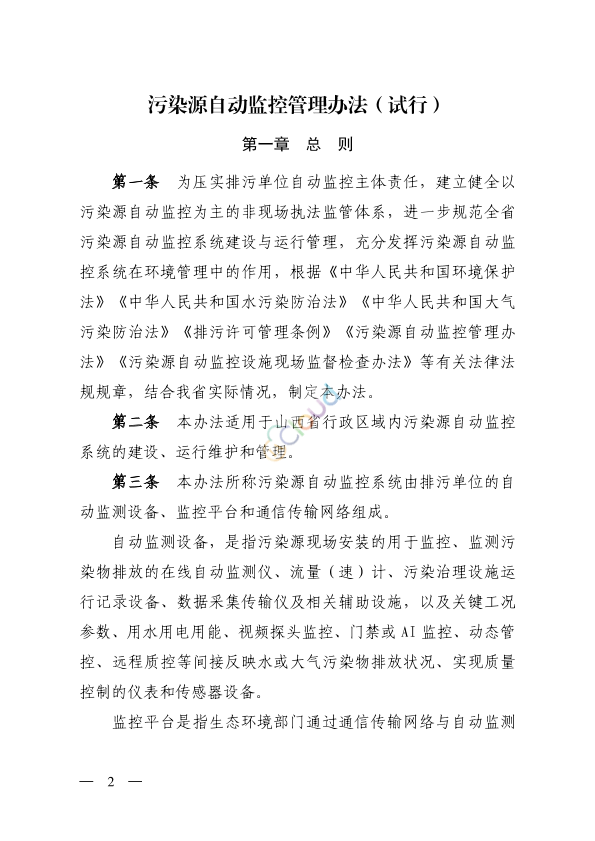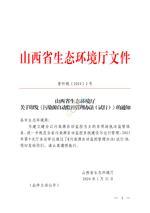 各市生态环境局: 为建立健全以污染源自动监控为主的非现场执法监管体系,进一步规范全省污染源自动监控系统建设与运行管理,2023年第9次厅务会审议通过了《污染源自动监控管理办法(试行)》,现印发给你们,请认真遵照执行。 山西省生态环境厅 2024 年 1 月 31 日