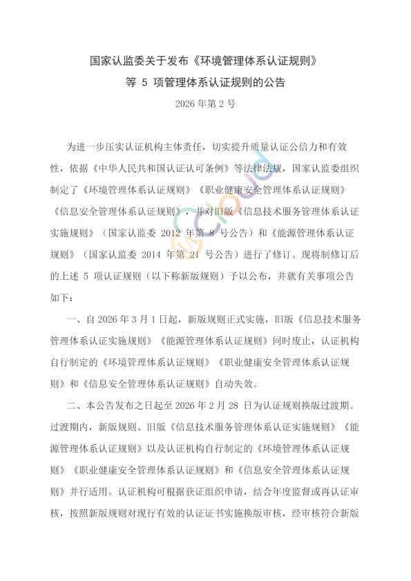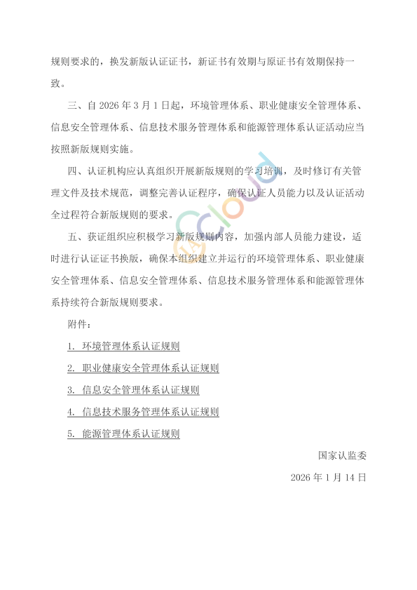 为进一步压实认证机构主体责任,切实提升质量认证公信力和有效性,依据《中华人民共和国认证认可条例》等法律法规,国家认监委组织制定了《环境管理体系认证规则》《职业健康安全管理体系认证规则》《信息安全管理体系认证规则》,并对旧版《信息技术服务管理体系认证实施规则》(国家认监委 2012 年第 8 号公告)和《能源管理体系认证规则》(国家认监委 2014 年第 21 号公告)进行了修订。现将制修订后的上述 5 项认证规则(以下称新版规则)予以公布,并就有关事项公告如下:
