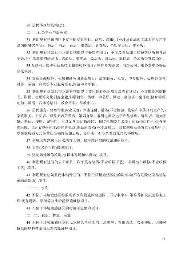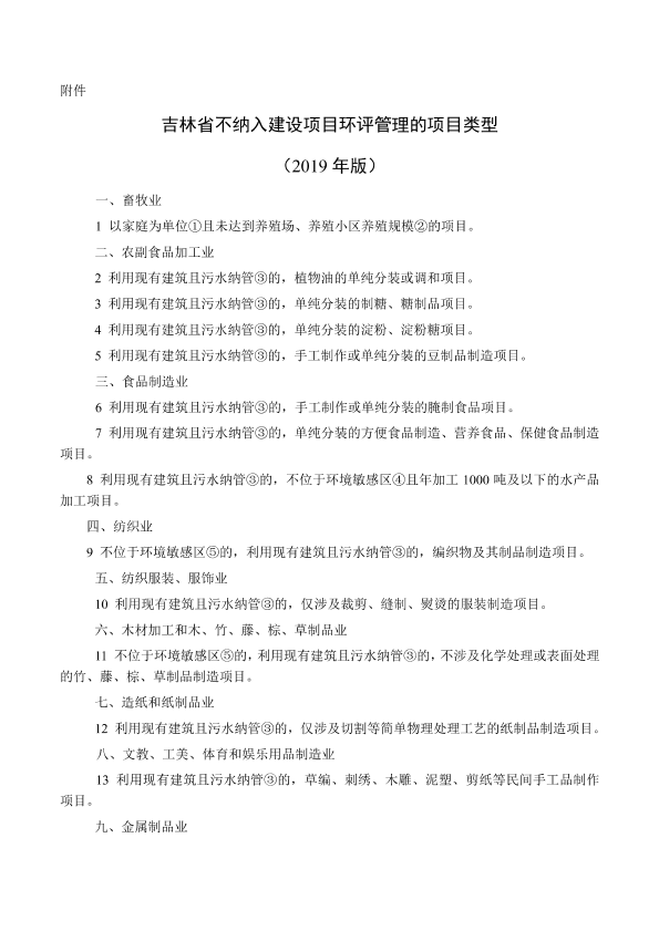 各市(州)、长白山管委会生态环境局,各县(市、区)环境保护局: 为贯彻落实国务院及省委、省政府深化行政审批制度改革的总体部署,服务民生工程建设,优化营商环境,促进小微企业发展,深入推进环评审批制度改革,按照“简政放权、放管结合、优化服务”的改革要求,结合我省实际,我厅研究制定了《吉林省不纳入建设项目环评管理的项目类型(2019年版)》,现印发给你们,请结合以下要求,认真遵照执行。 一、列入《吉林省不纳入建设项目环评管理的项目类型(2019年版)》的项目,不需要办理建设项目环境影响评价相关手续,但不免除建设单位应当承担的生态环境保护责任。 二、建设单位在项目建设及运营过程中应遵守国家及本省生态环境保护法律、法规、标准和有关技术规范要求,确保污染物达标排放。同时,自觉接受各级生态环境主管部门的日常监督管理。 三、《建设项目环境影响评价分类管理名录》中明确规定不纳入环评管理的建设项目的有关要求,遵照执行。 四、本通知自印发之日起实施。 附件:吉林省不纳入建设项目环评管理的项目类型(2019年版) 吉林省生态环境厅 2019年6月6日