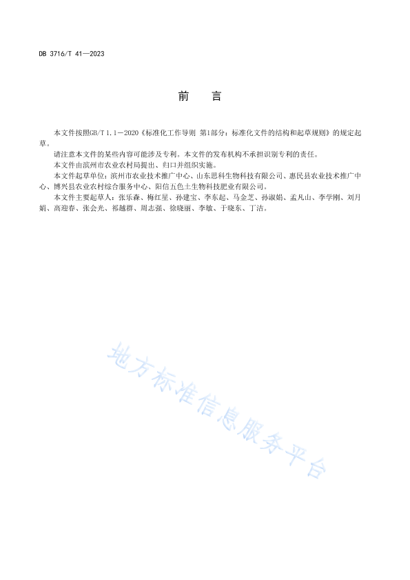 本文件按照GB/T 1.1-2020《标准化工作导则 第1部分:标准化文件的结构和起草规则》的规定起草。 请注意本文件的某些内容可能涉及专利。本文件的发布机构不承担识别专利的责任。 本文件由滨州市农业农村局提出、归口并组织实施。 本文件起草单位:滨州市农业技术推广中心、山东思科生物科技有限公司、惠民县农业技术推广中心、博兴县农业农村综合服务中心、阳信五色土生物科技肥业有限公司。