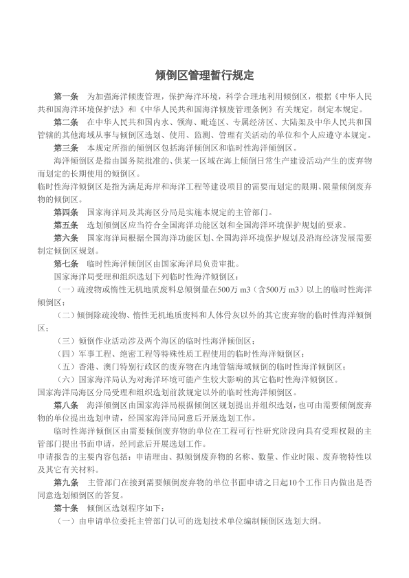 各分局,沿海各省、自治区、直辖市及计划单列市海洋厅(局): 为了加强海洋倾倒区的管理,根据《中华人民共和国海洋环境保护法》和《中华人民共和国海洋倾废管理条例》的有关规定,我局制定了《倾倒区管理暂行规定》。现印发给你们,请遵照执行。 二零零三年十一月十四日