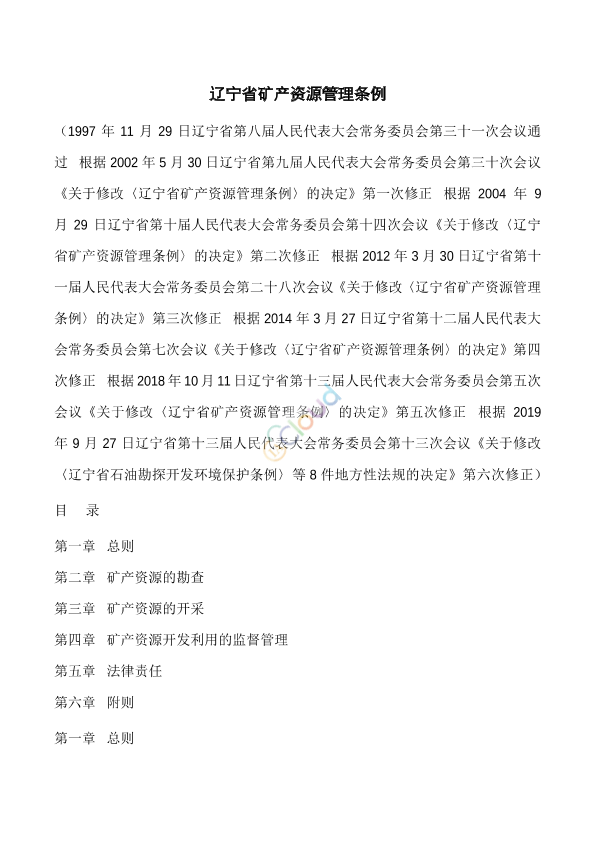 (1997年11月29日辽宁省第八届人民代表大会常务委员会第三十一次会议通过 根据2002年5月30日辽宁省第九届人民代表大会常务委员会第三十次会议《关于修改〈辽宁省矿产资源管理条例〉的决定》第一次修正 根据2004年9月29日辽宁省第十届人民代表大会常务委员会第十四次会议《关于修改〈辽宁省矿产资源管理条例〉的决定》第二次修正 根据2012年3月30日辽宁省第十一届人民代表大会常务委员会第二十八次会议《关于修改〈辽宁省矿产资源管理条例〉的决定》第三次修正 根据2014年3月27日辽宁省第十二届人民代表大会常务委员会第七次会议《关于修改〈辽宁省矿产资源管理条例〉的决定》第四次修正 根据2018年10月11日辽宁省第十三届人民代表大会常务委员会第五次会议《关于修改〈辽宁省矿产资源管理条例〉的决定》第五次修正 根据2019年9月27日辽宁省第十三届人民代表大会常务委员会第十三次会议《关于修改〈辽宁省石油勘探开发环境保护条例〉等8件地方性法规的决定》第六次修正)