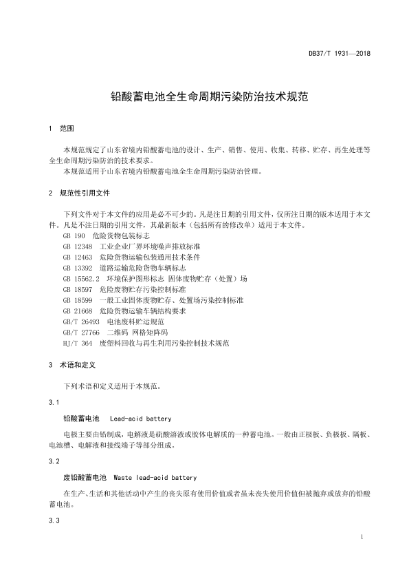 本规范规定了山东省境内铅酸蓄电池的设计、生产、销售、使用、收集、转移、贮存、再生处理等全生命周期污染防治的技术要求。 本规范适用于山东省境内铅酸蓄电池全生命周期污染防治管理。