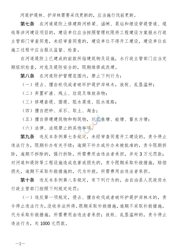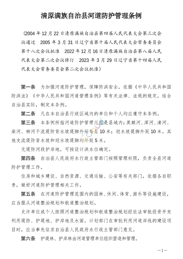 为加强河道防护管理,保障防洪安全,依据《中华人民共和国防洪法》《中华人民共和国河道管理条例》等有关法律、法规的规定,结合自治县实际,制定本条例。