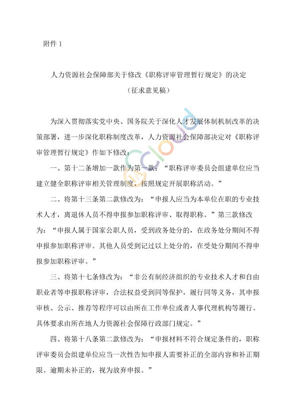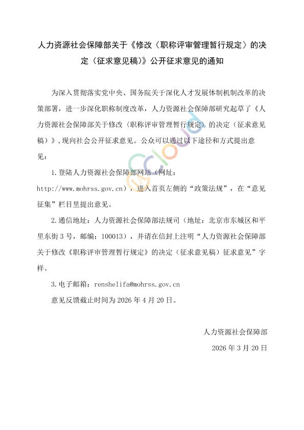 为深入贯彻落实党中央、国务院关于深化人才发展体制机制改革的决策部署,进一步深化职称制度改革,人力资源社会保障部研究起草了《人力资源社会保障部关于修改〈职称评审管理暂行规定〉的决定(征求意见稿)》,现向社会公开征求意见。公众可以通过以下途径和方式提出意见: 1.登陆人力资源社会保障部网站(网址:http://www.mohrss.gov.cn),进入首页左侧的“政策法规”,在“意见征集”栏目里提出意见。 2.通信地址:人力资源社会保障部法规司(地址:北京市东城区和平里东街3号,邮编:100013),并请在信封上注明“人力资源社会保障部关于修改《职称评审管理暂行规定》的决定(征求意见稿)征求意见”字样。 3.电子邮箱:renshelifa@mohrss.gov.cn 意见反馈截止时间为2026年4月20日。 人力资源社会保障部 2026年3月20日