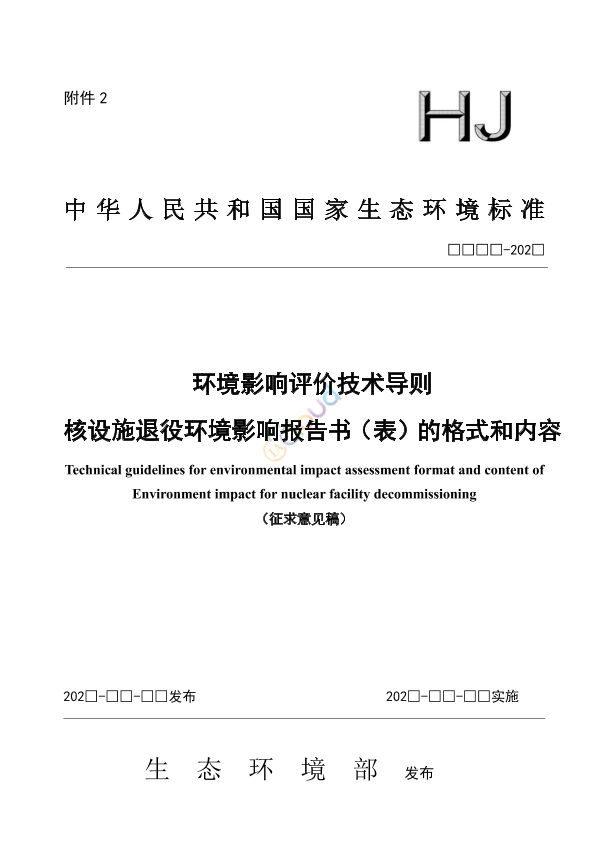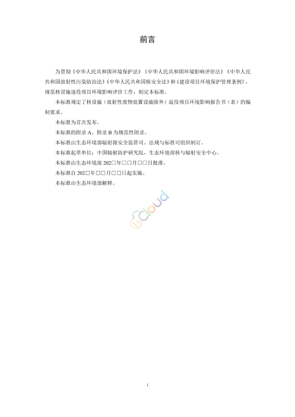 为贯彻《中华人民共和国环境保护法》《中华人民共和国环境影响评价法》《中华人民共和国放射性污染防治法》《中华人民共和国核安全法》和《建设项目环境保护管理条例》,规范核设施退役项目环境影响评价工作,制定本标准。 本标准规定了核设施(放射性废物处置设施除外)退役项目环境影响报告书(表)的编制要求。 本标准为首次发布。 本标准的附录 A、附录 B 为规范性附录。 本标准由生态环境部辐射源安全监管司、法规与标准司组织制订。 本标准起草单位:中国辐射防护研究院,生态环境部核与辐射安全中心。 本标准由生态环境部 202□年□□月□□日批准。 本标准自 202□年□□月□□日起实施。 本标准由生态环境部解释。