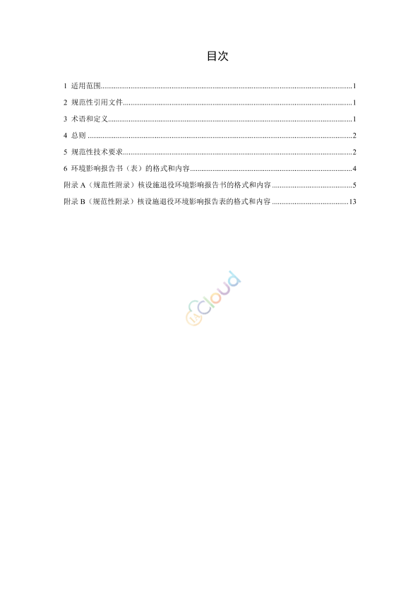 本标准规定了核设施(放射性废物处置设施除外)退役项目环境影响报告书(表)的编制要求。 本标准适用于核设施退役项目的环境影响评价工作,放射性污染治理项目环境影响评价可参照执行。